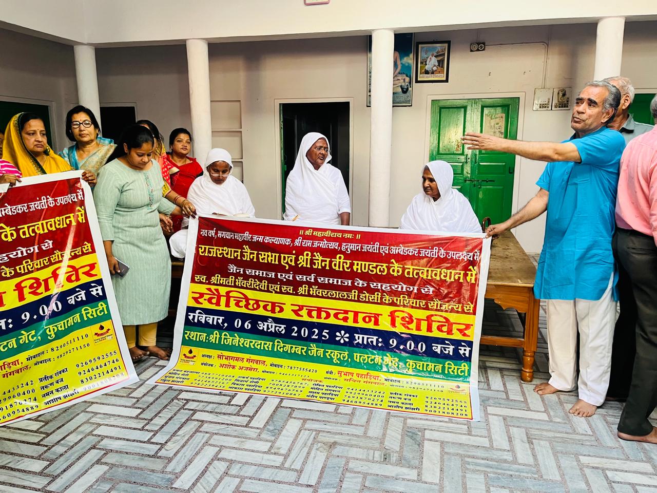 कुचामन सिटी। नववर्ष, रामनवमी, भगवान महावीर जन्म कल्याणक महोत्सव, वीर हनुमान, डॉ भीमराव अम्बेडकर जयंती पर जिनेश्वर दास दिगम्बर माध्यमिक विद्यालय, पलटन गेट पर सर्व समाज व जैन समाज कुचामन द्वारा स्व. भवरीदेवी व स्व. भवरलालजी डोसी परिवार के सौजन्य से राजस्थान जैन सभा व श्री जैन वीर मण्डल कुचामन के तत्वावधान में आयोजित रक्तदान शिविर प्रचार-प्रसार हेतु पोस्टर का विमोचन परम पुज्य गणिनी आर्यिका सरस्वती माताजी, अनन्तमति माताजी, महोत्सव मति माताजी के सानिध्य में नथमल, सोभागमल, विनोद, अशोक, विपुल गगवांल देवेन्द्र, जयकुमार, विजय, मुकेश पहाडिया, सुभाष, पंकज रावका, राजकुमार सेठी, राजकुमार, विनोद काला, विमल पाटनी, रविकांत पाटोदी, समाज के श्रावक-श्राविकाओ ने विमोचन कर रक्तदान शिविर को सफल बनाने का आश्वासन दिया।