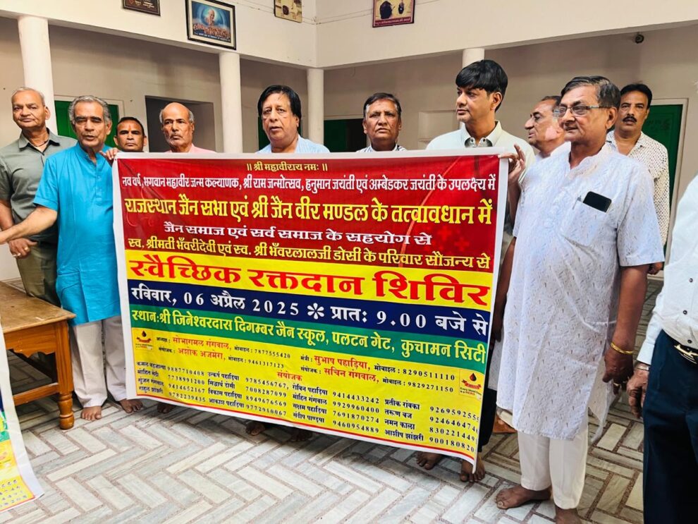 भगवान महावीर जन्म कल्याणक महोत्सव पर जिनेश्वर दास दिगम्बर माध्यमिक विद्यालय पर सर्व समाज व जैन समाज कुचामन द्वारा डोसी परिवार के सौजन्य से राजस्थान जैन सभा व श्री जैन वीर मण्डल कुचामन के तत्वावधान में आयोजित रक्तदान शिविर प्रचार प्रसार हेतु पोस्टर का विमोचन किया गया। पढ़िए कुचामन सिटी से सुभाष पहाडिया की यह पूरी खबर…