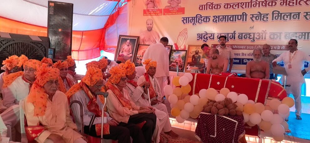 जैन मित्र मण्डल द्वारा आयोजित सामूहिक क्षमावाणी स्नेह मिलन समारोह में 80 वर्ष से अधिक 31 सजातीय बुजुर्ग बंधुओं का बहुमान किया गया। सभी बुजुर्गों को ससम्मान मंचासीन कर सभी को स्वाफा बांधा गया। तिलक, श्रीफल, शाल, मणिमाला, प्रशस्ति पत्र देकर सभी बुजुर्गों का सम्मान किया गया। सम्मान की बेला में बुजुर्ग बंधुओं के चेहरे पर एक अदभुद मुस्कान को देखकर आयोजकगढ़ गदगद हो गए।