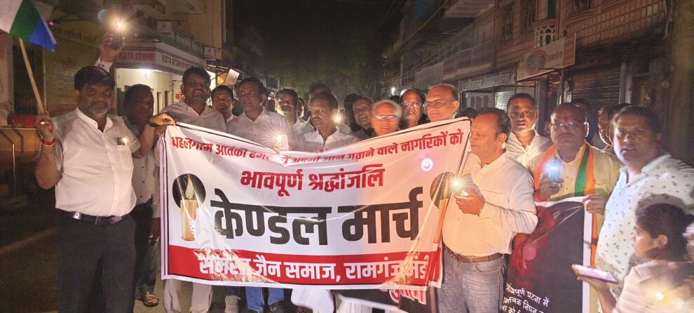 रामगंजमंडी। कश्मीर के पहलगांव में आतंकवादियों ने 27 पर्यटकों की निर्ममता से हत्या कर दी। इस घटना में कई घायल हुए। इस घटना से पूरा देश शोक मग्न है। इस निंदनीय कृत्य के विरोध एवं मृतकों को श्रद्धांजलि देने हेतु जैन सोशल ग्रुप फेडरेशन के आह्वान पर सकल जैन समाज ने शनिवार को कैंडल मार्च निकाला। यह कैंडल मार्च शांतिनाथ दिगंबर जैन मंदिर से प्रारंभ होकर माल गोदाम चौराहा पन्नालाल सर्कल, अंबेडकर सर्किल स्टेशन चौराहा होता हुआ शाहजी चौराहे पर पहुंचा। सभी शहीद स्मारकों पर दीप जलाकर श्रद्धांजलि दी गई। इस निर्मम हत्याकांड से समस्त जैन समाज आहत है।