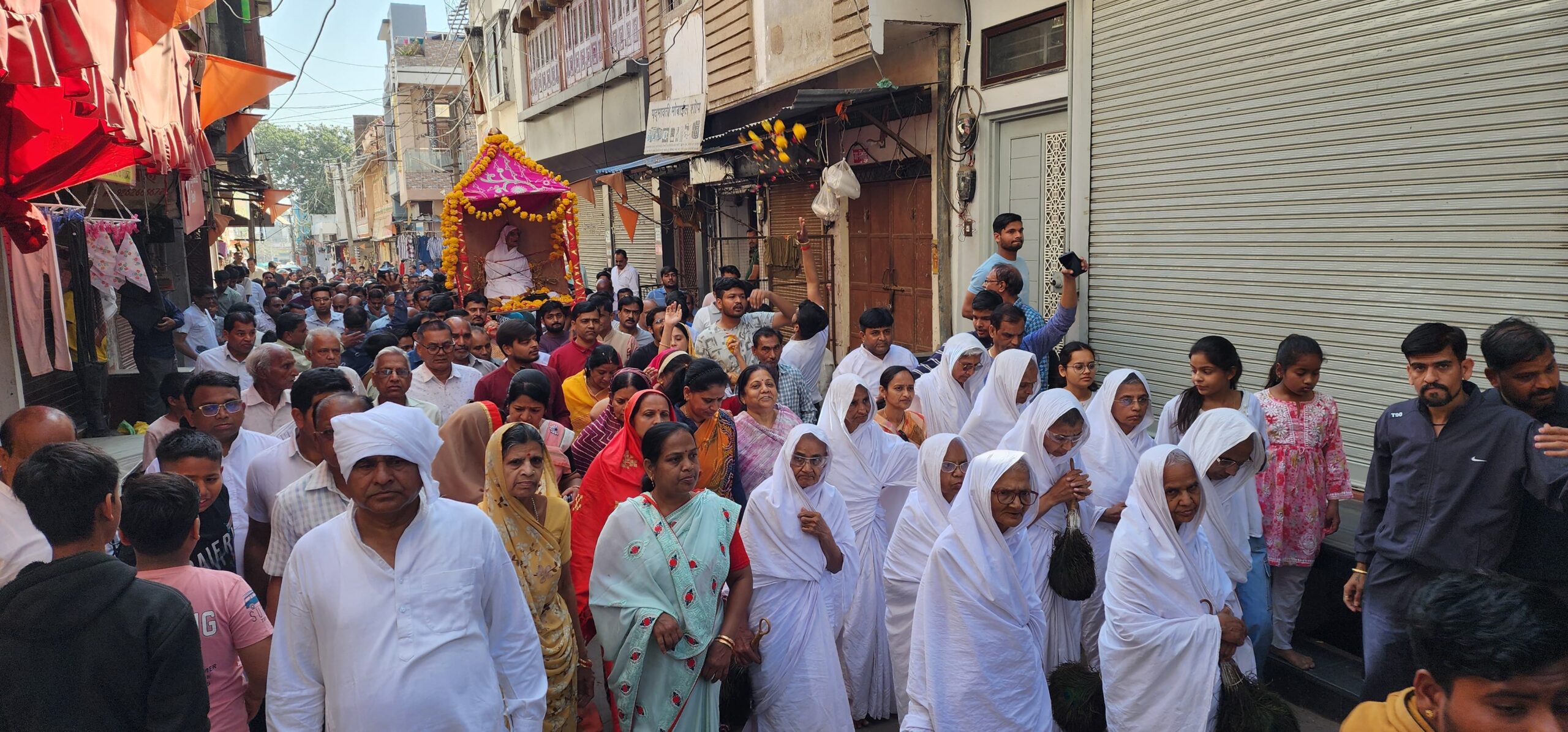 धरियावद। दिन रात मेरे स्वामी, में भावना यह भावु ।देहांत के समय मे तुमको न भूल जावू। मरण समय गुरु पाद मूल हो व्रत संयम पालू ,पंडित पंडित मरण हो ऐसा अवसर दो। इन सार गर्भित भावनाओं को बिरले ही भव्य जीव अपने जीवन मे चरितार्थ करते हैं। आचार्यश्री अजित सागर जी के शिष्य मुनिश्री पुण्य सागर से दीक्षित शिष्या 75 वर्षीय आर्यिका श्री स्वर्णमति जी का 15 फरवरी को रात्रि 8.30 बजे धरियावद में समस्त संघ सानिध्य में समाधिमरण हो गया। ब्रह्मचारिणी वीणा दीदी, भरत एवं अध्यक्ष जैन समाज ने बताया कि प्रातः 8 बजे समाधिस्थ आर्यिकाश्री स्वर्णमति जी की डोला विमान यात्रा मुनिश्री पुण्य सागर जी संघ सानिध्य और हजारों श्रद्धालुओं की उपस्थिति में निकाली गई। आर्यिकाश्री के डोले के आगे कमंडल लेकर भूमि शुद्धि का, आर्यिका श्री के डोले को कंधे लगाने का सौभाग्य मनीष आसाम, पायल संभव पहाड़िया मुंबई एवं परिजनों को प्राप्त हुआ। नियत समाधि स्थल परिसर में ,पंडित विशाल के निर्देशन में मंत्रोचार से स्थल शुद्धि की गई।