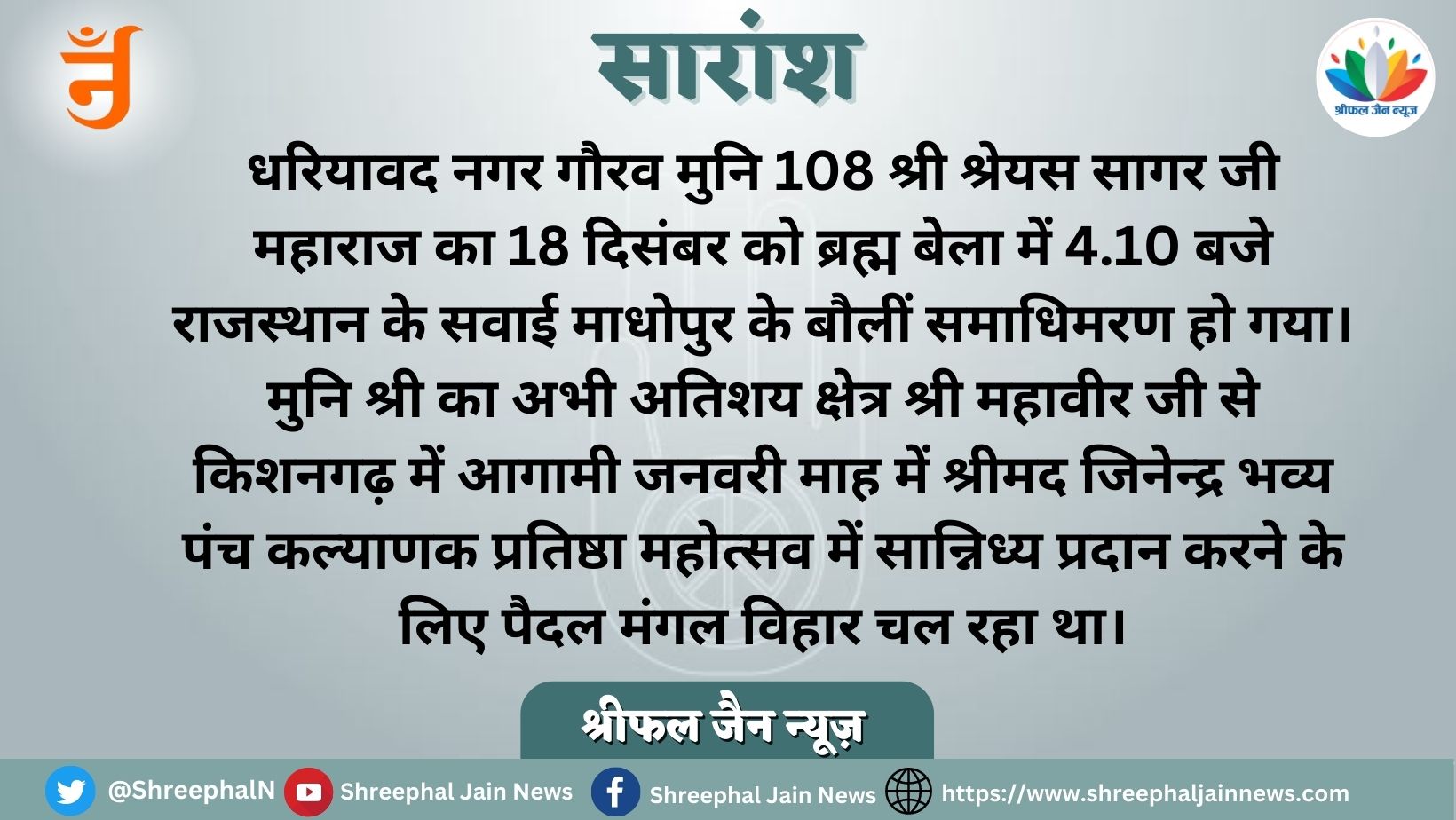 धरियावद (अशोक जेतावत)। दिगम्बर जैन आचार्य वात्सल्य वारिधि आचार्य 108 श्री वर्द्धमान सागर जी महाराज से दीक्षित एवं उनके संघस्थ धरियावद नगर गौरव मुनि 108 श्री श्रेयस सागर जी महाराज का 18 दिसंबर को ब्रह्म बेला में 4.10 बजे राजस्थान के सवाई माधोपुर के बौलीं समाधिमरण हो गया।