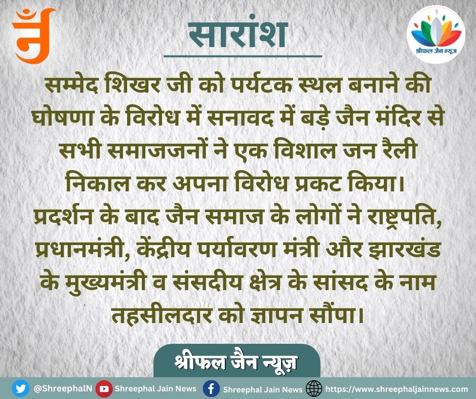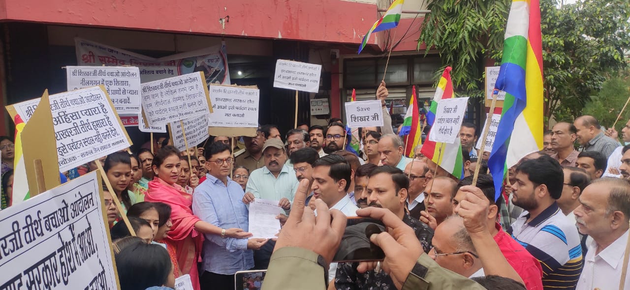 लेकिन आज तक जैन समाज की मांग पर सुनवाई नहीं हुई है। प्रदर्शन के बाद जैन समाज के लोगों ने राष्ट्रपति, प्रधानमंत्री, केंद्रीय पर्यावरण मंत्री और झारखंड के मुख्यमंत्री व संसदीय क्षेत्र के सांसद के नाम तहसीलदार को ज्ञापन सौंपते हुए सम्मेद शिखर पर्वत को पर्यटक स्थल की सूची से बाहर करने की मांग की है। इस अवसर पर सकल जैन समाज के सभी समाजजन उपस्थित हुए।