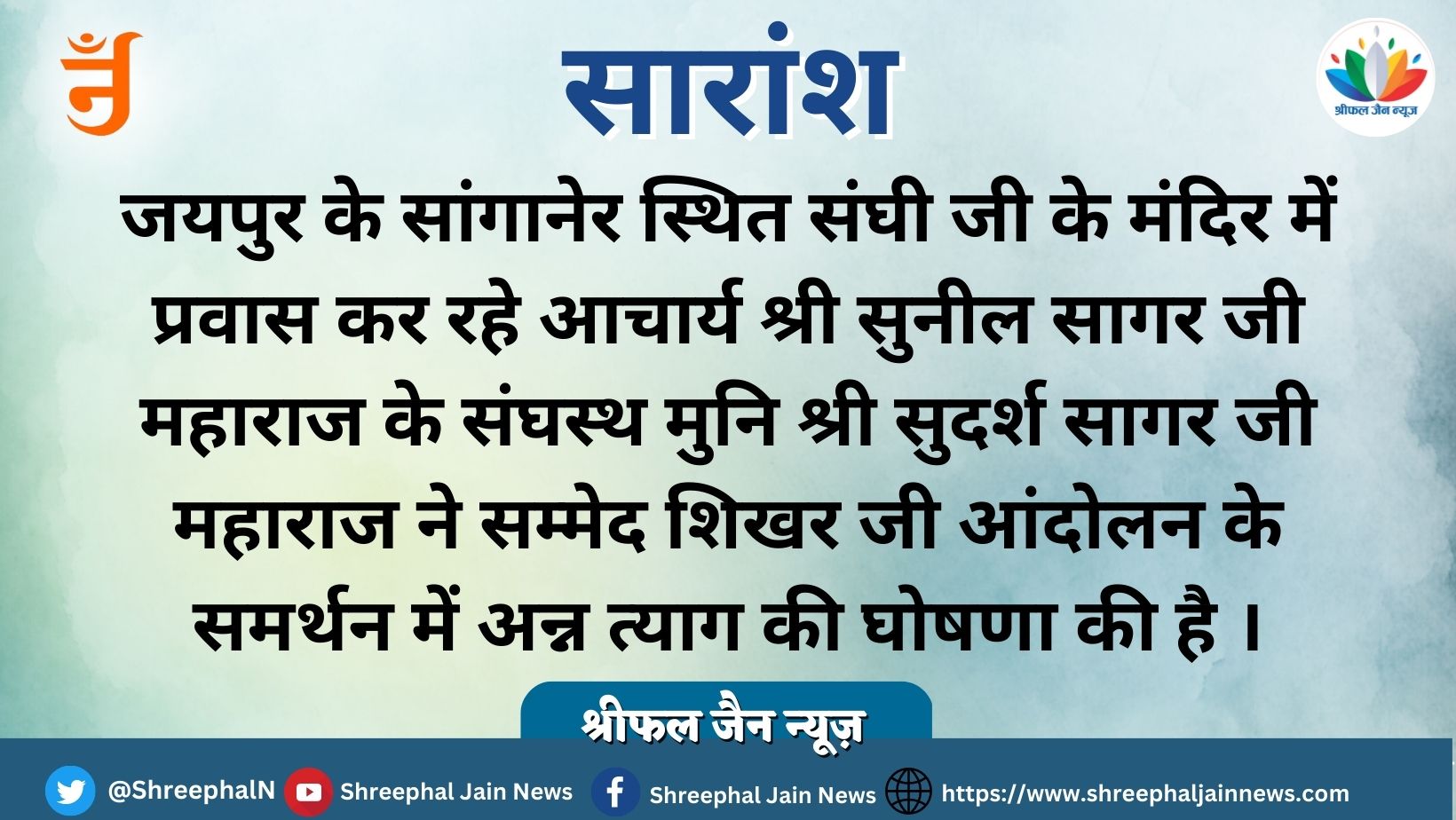 मंदिर प्रबंध समिति के मंत्री सुनील कासलीवाल ने बताया कि महाराज जी ने निर्णय किया है कि जब तक सरकार सम्मेद शिखर जी के बारे में अपना निर्णय नहीं बदलती है तब तक वे अन्न ग्रहण नही करेंगे । उल्लेखनीय है कि आचार्य सुनील सागर जी महाराज के संघ के ही मुनि श्री सुज्ञेय सागर जी महाराज का मंगलवार को समाधि मरण हो गया था।
