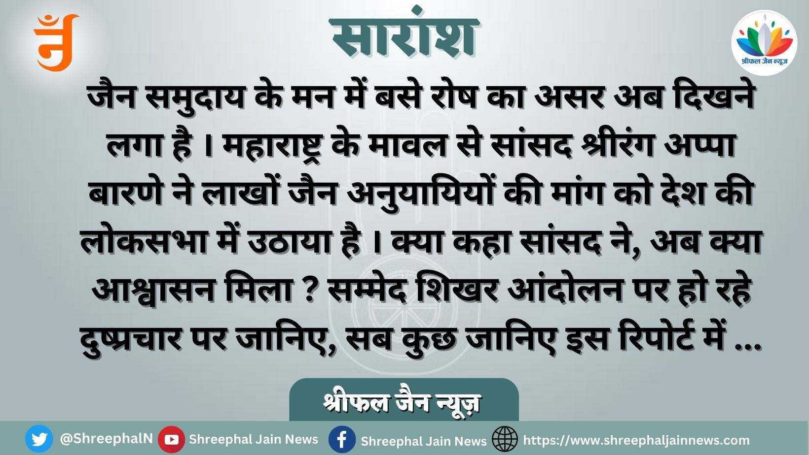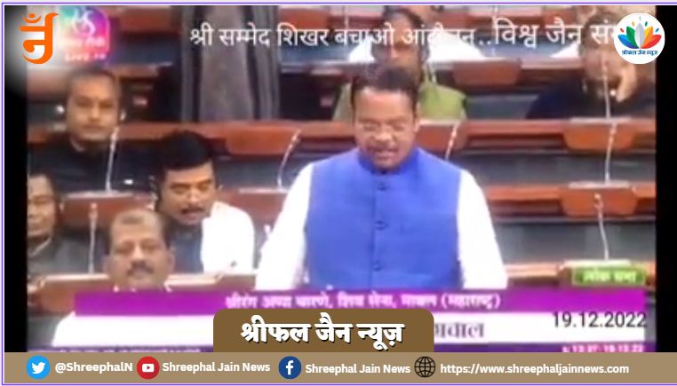 महाराष्ट्र की मावल लोकसभा सीट से सांसद श्रीरंग अप्पा बारणे ने सोमवार को लोकसभा में जैन समुदाय की चिंताओं को रखा । सम्मेद शिखर को केन्द्र और राज्य सरकार ने अधिसूचना जारी कर इसे पर्यटन का केन्द्र बनाने की घोषणा कर दी है ।