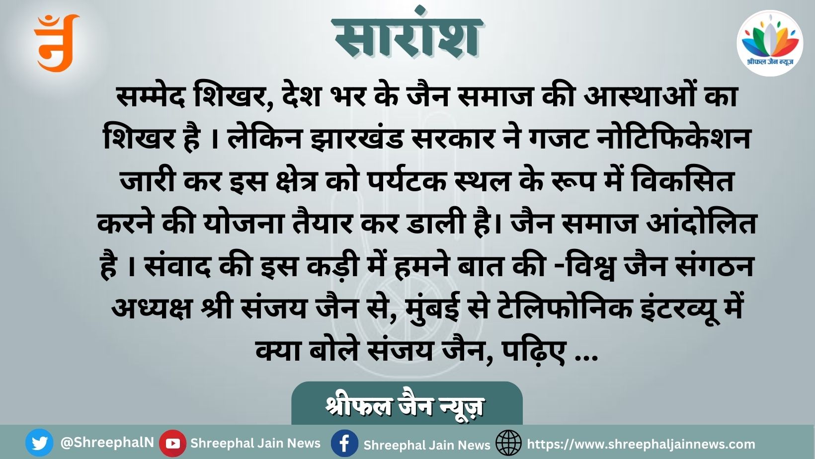 “हर धर्म और समाज की आस्थाओं को ठेस न पहुंचे इसका ध्यान रखने की गारंटी हमारा संविधान देता है । लेकिन क्या सम्मेद शिखर को पर्यटक स्थल बनाने के मामले में ऐसा हो रहा है ? श्रीफल जैन न्यूज़ संवाददाता के सवालों का जबाव देते हुए मुंबई से विश्व जैन संगठन के अध्यक्ष श्री संजय जैन इस मुद्दे पर बहुत संवेदनशील दिखे और हर हाल में इस फैसले का विरोध करने की बात करते दिखे ।