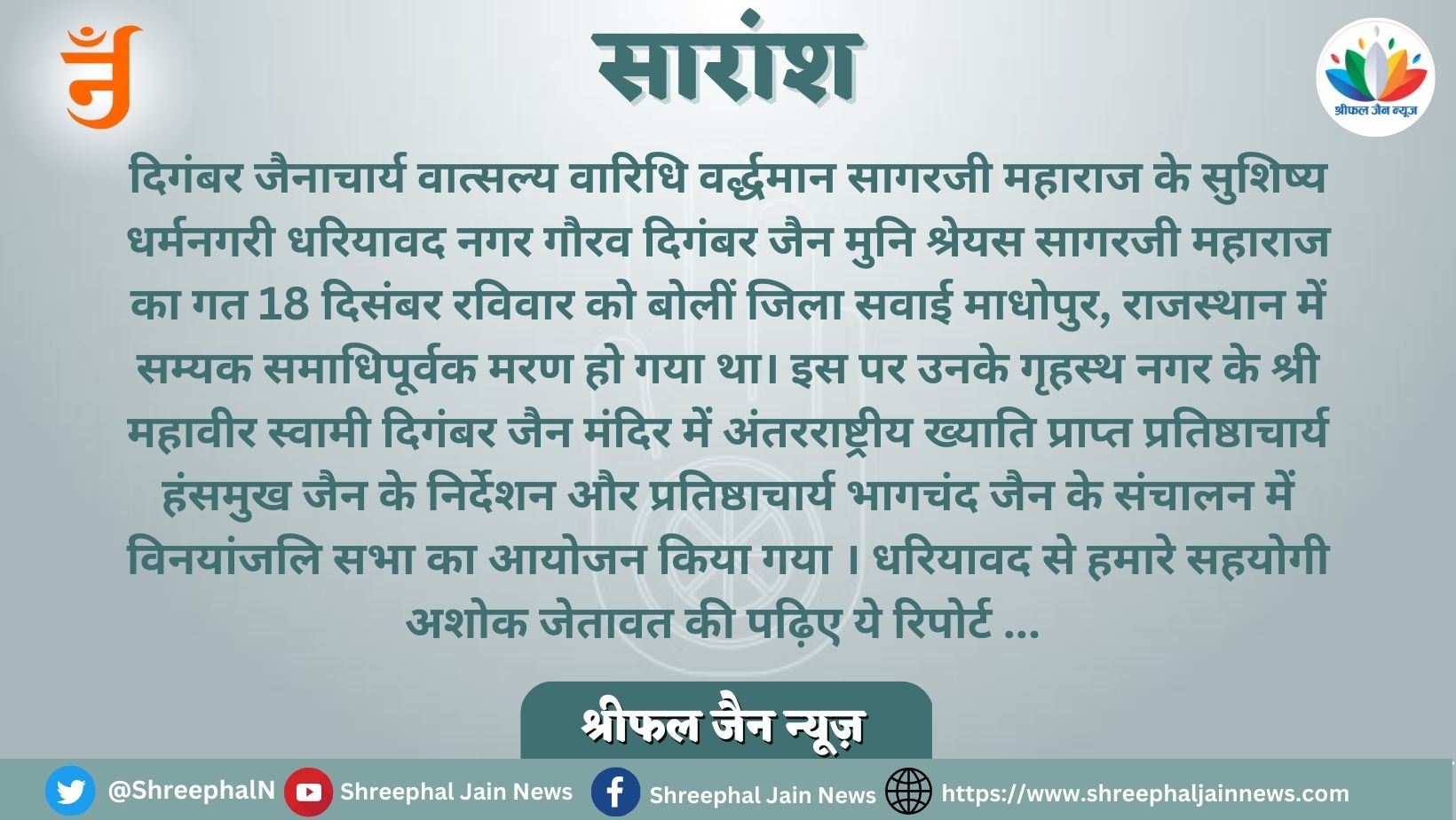 अशोक जेतावत | धरियावद नगर गौरव दिगंबर जैन मुनि श्रेयस सागरजी महाराज का गत 18 दिसंबर रविवार को बोलीं जिला सवाई माधोपुर, राजस्थान में सम्यक समाधिपूर्वक मरण हो गया था । सभा की शुरुआत में प्रतिष्ठाचार्य हंसमुख जैन ने उप जिला प्रमुख सागरमल बोहरा, समाज सेठ दिनेश कुमार जैकणावत, मुनिश्री के गृहस्थ पुत्र सुनील भोपावत एवं अन्य रिश्तेदारों ने दीप प्रज्वलन किया ।