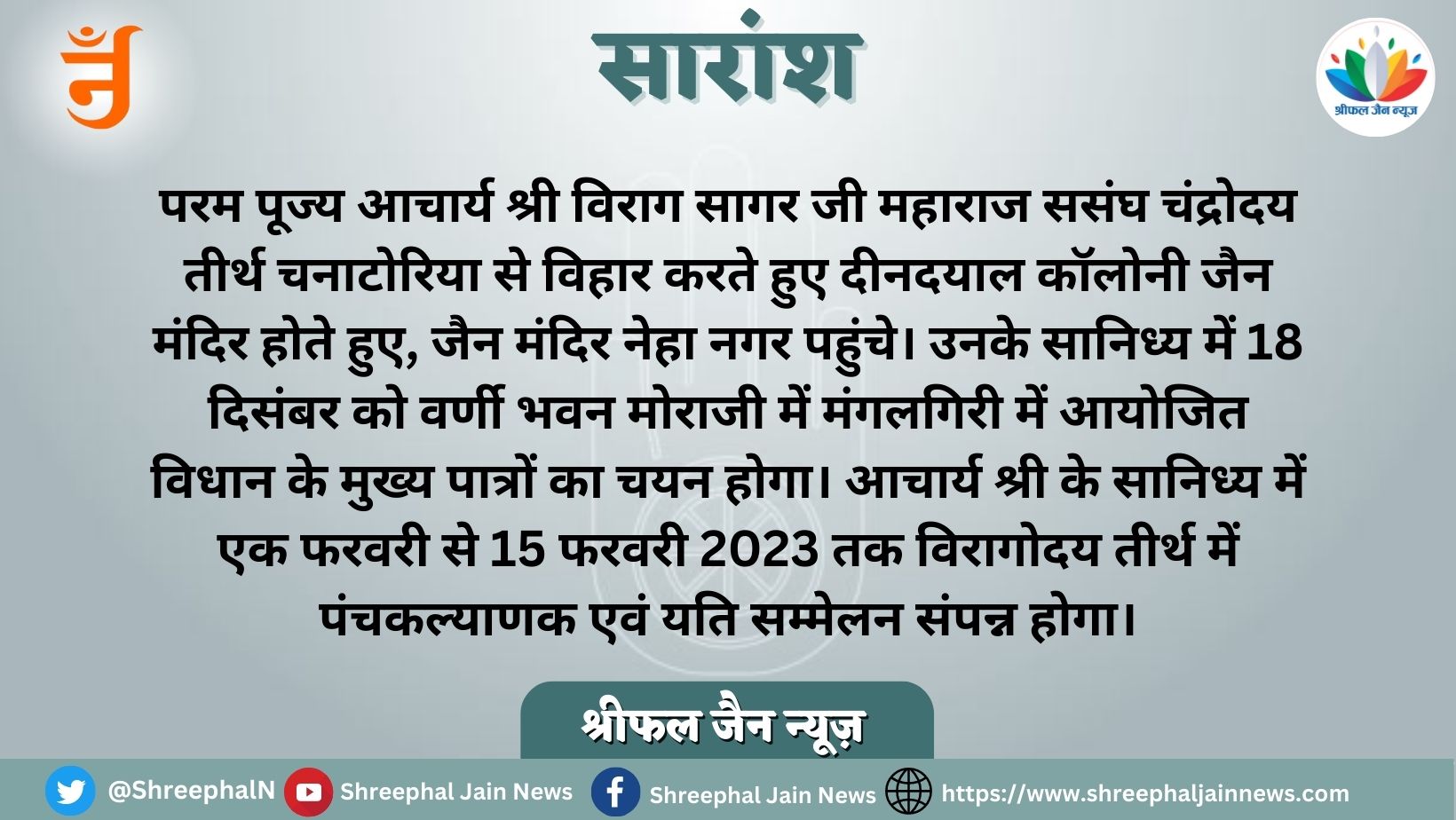आचार्य श्री के संघ में सागर नगर गौरव मुनि श्री विवर्धन सागर जी महाराज एवं आयिका विवक्त श्री माताजी का 22 वर्षों बाद प्रवेश हो रहा है। आचार्य श्री नेहा नगर से विहार करते हुए अंकुर कॉलोनी मोरा जी होते हुए मंगलगिरि में प्रवेश करेंगे।
