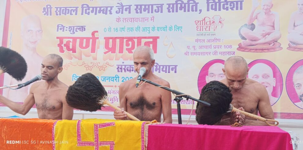विदिशा। विदिशा नगर में गुरुवार का दिन ऐतिहासिक बन गया। जब यहां पर सकल दिगंबर जैन समाज के लगभग पांच सौ से अधिक कार्यकर्ताओं ने नगर के सभी प्राथमिक एवं माध्यमिक विद्यालयों में जाकर आचार्य श्री विद्यासागरजी महाराज के आशीर्वाद की दो बूंद स्वर्णप्राशन की पिलाई। प्रातःकाल कार्यक्रम का शुभारंभ कांच मंदिर के पास बने विशेष पांडाल में मुनि श्री संभवसागर महाराज, मुनि श्री निस्सीम सागर महाराज, मुनि श्री संस्कार सागर महाराज के आशीर्वाद के बाद सभी बच्चों को स्वर्णप्राशन पिलाने का कार्य प्रारंभ किया गया। नगर में शीतलहर होने से नर्सरी से कक्षा पांच तक के बच्चों का शासकीय अवकाश घोषित था। नगर में “स्वर्णप्राशन” का कार्य पुष्य नक्षत्र में गुरुवार के दिन ही होना निश्चित था। इसलिए सभी स्कूलों में एक साथ प्रारंभ किया गया। जिसमें नर्सरी से पांचवीं तक के छोटे बच्चों के अभिभावक खुद अपने बच्चों को स्वर्णप्राशन पिलाने के लिए माधवगंज चौक पर कांच मंदिर स्थित पांडाल में लेकर आए। सभी स्कूलों में भी बच्चों को यह स्वर्णप्राशन की दवा निःशुल्क पिलाई गई।
