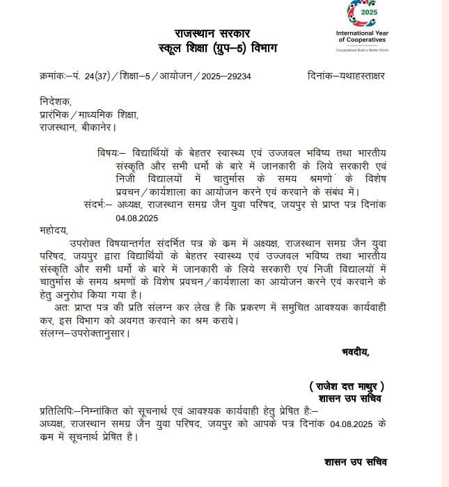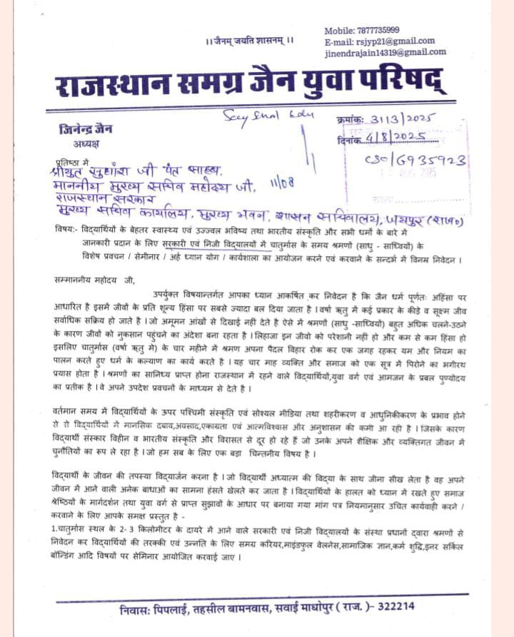 राजस्थान सरकार ने विद्यार्थियों के मानसिक तनाव दूर करने व सकारात्मक सोच विकसित करने के लिए विद्यालयों में श्रमण साधु-साध्वियों के प्रवचन और अर्ह ध्यान योग शिविर आयोजित करने का निर्णय लिया है। जैन समाज ने इस कदम का स्वागत किया। पढ़िए पूरी रिपोर्ट…