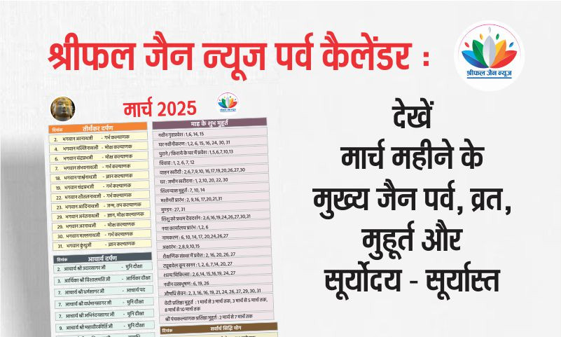 मार्च महीने के मुख्य जैन पर्व, व्रत, मुहूर्त और सूर्योदय – सूर्यास्त आप हमारे श्रीफल जैन पर्व कैलेंडर में देख सकते हैं। प्रस्तुति संपादक रेखा संजय जैन….