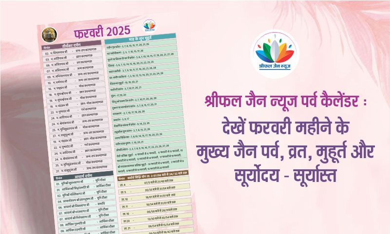 फरवरी महीने के मुख्य जैन पर्व, व्रत, मुहूर्त और सूर्योदय – सूर्यास्त आप हमारे श्रीफल जैन पर्व कैलेंडर में देख सकते हैं। प्रस्तुति संपादक रेखा संजय जैन….