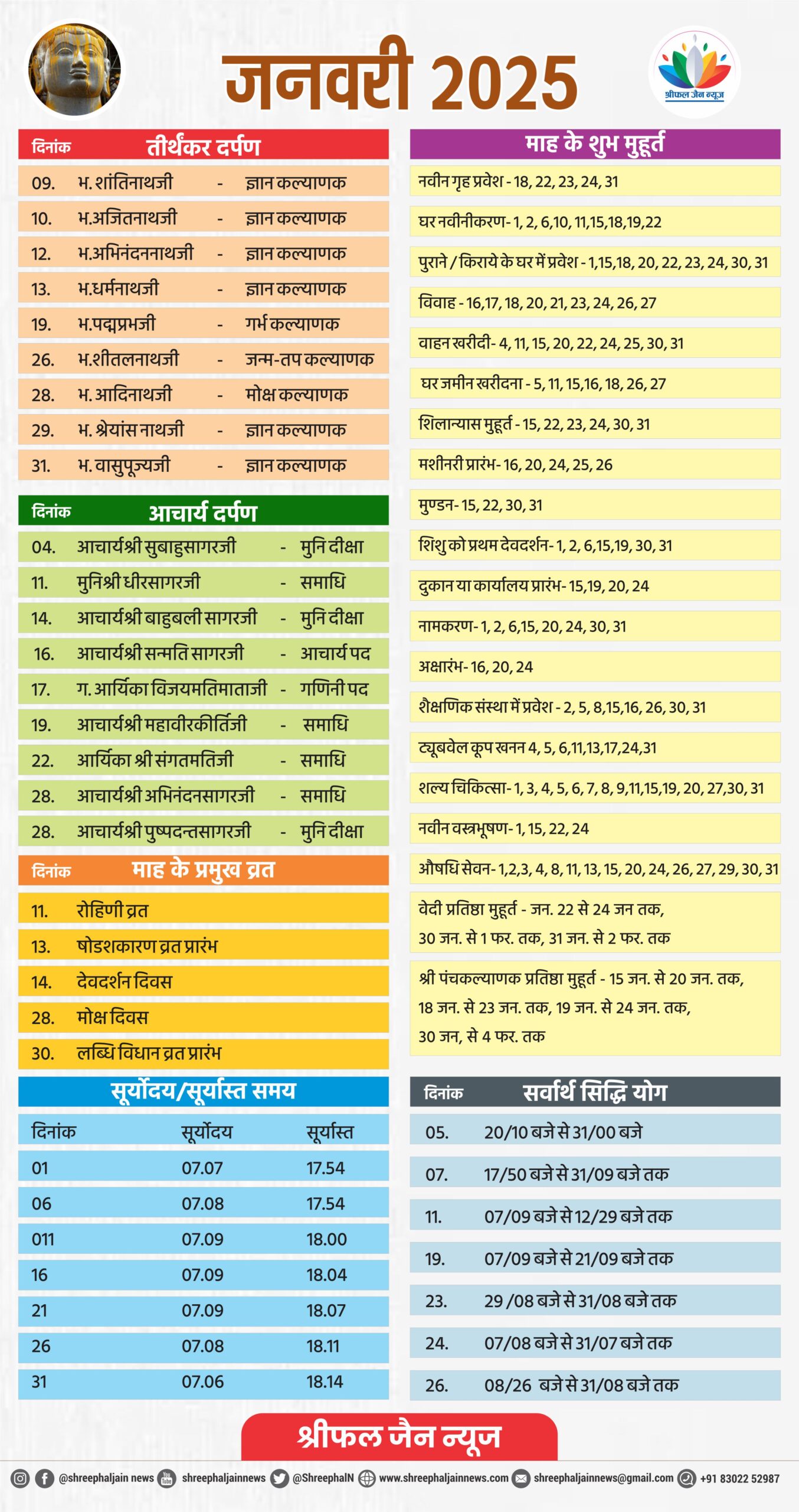 श्रीफल जैन न्यूज पर्व कैलेंडर : देखें जनवरी महीने के मुख्य जैन पर्व, व्रत, मुहूर्त और सूर्योदय – सूर्यास्त