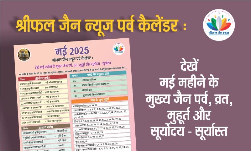 मई महीने के मुख्य जैन पर्व, व्रत, मुहूर्त और सूर्योदय – सूर्यास्त आप हमारे श्रीफल जैन पर्व कैलेंडर में देख सकते हैं। प्रस्तुति संपादक रेखा संजय जैन….
