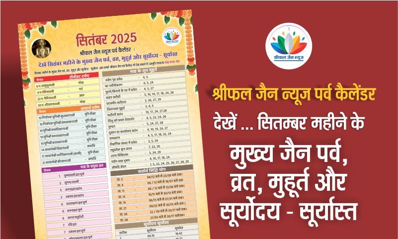 सितंबर महीने के मुख्य जैन पर्व, व्रत, मुहूर्त और सूर्योदय – सूर्यास्त आप हमारे श्रीफल जैन पर्व कैलेंडर में देख सकते हैं। प्रस्तुति संपादक रेखा संजय जैन….