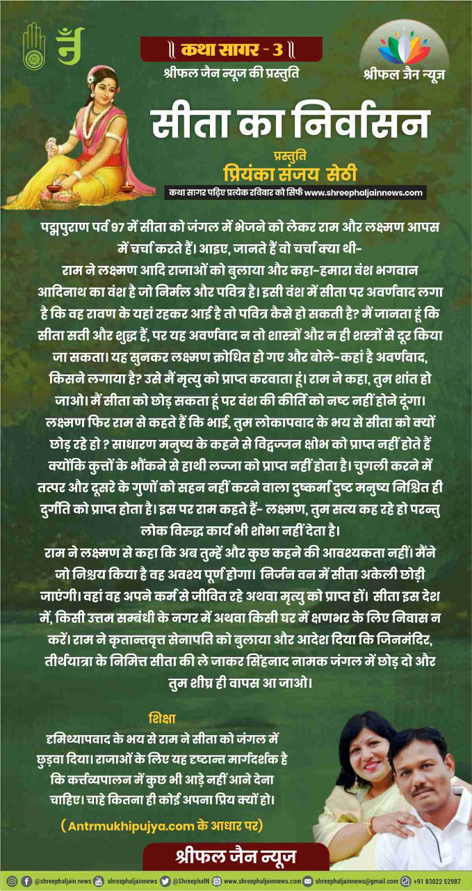 राम ने लक्ष्मण आदि राजाओं को बुलाया और कहा-हमारा वंश भगवान आदिनाथ का वंश है जो निर्मल और पवित्र है। इसी वंश में सीता पर अवर्णवाद लगा है कि वह रावण के यहां रहकर आई है तो पवित्र कैसे हो सकती है?