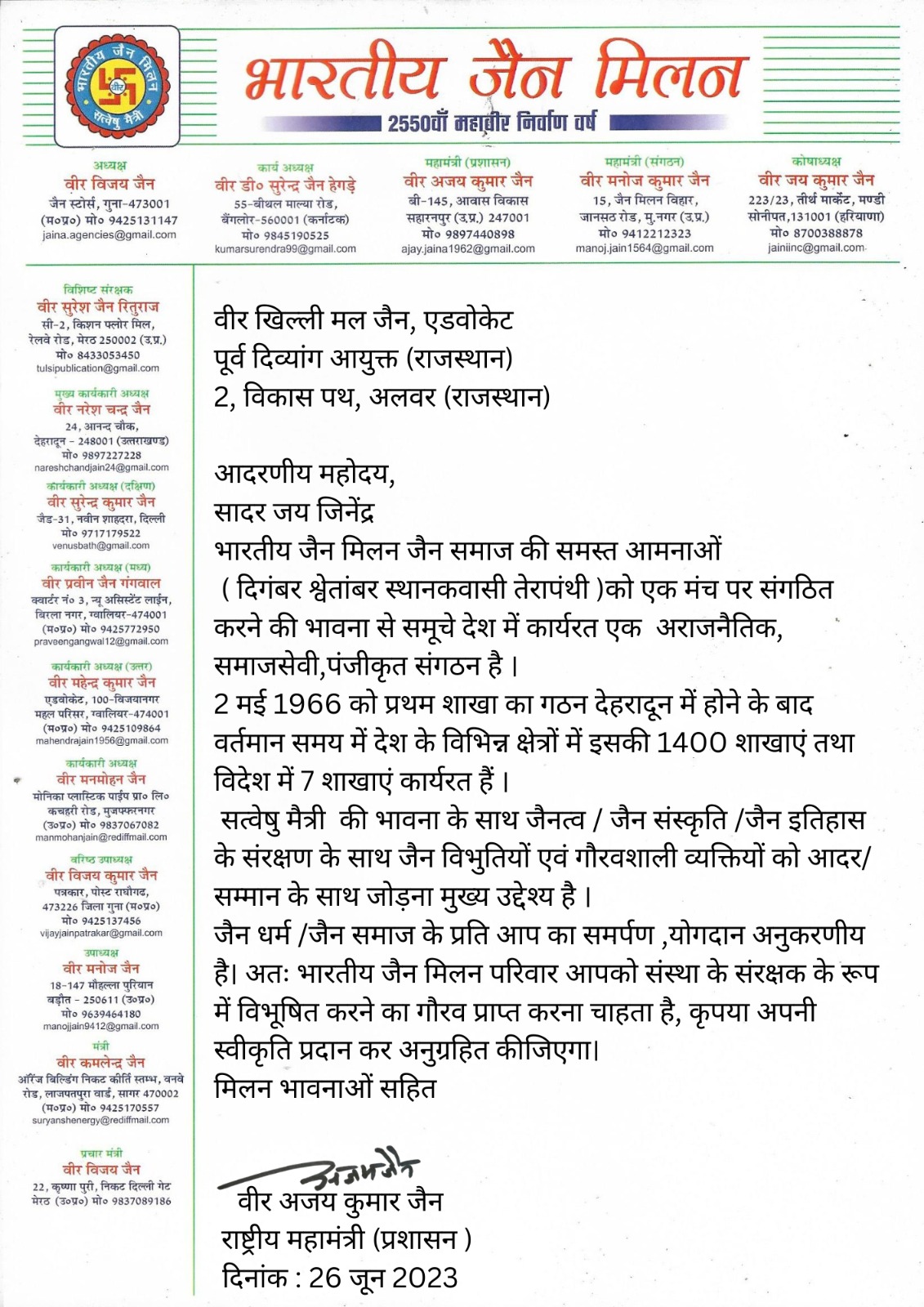 जयपुर। जैन समुदाय के प्रख्यात समाजसेवी खिल्ली मल जैन को उनके समुदाय के प्रति समर्पण भाव व धर्म के प्रति आस्था और समुदाय की एकता के प्रति प्रतिबद्धता से प्राभावित होकर भारतीय जैन मिलन के राष्ट्रीय अध्यक्ष अतिवीर विजय जैन व राष्ट्रीय विशिष्ट संरक्षक अतिवीर सुरेश जैन ऋतुराज और राष्ट्रीय महामंत्री अतिवीर अजय कुमार जैन ने संगठन के सभी पदाधिकारियों एवं समाजश्रेष्ठियों की सहमति से राजस्थान में नि:शक्तजनों की सेवा एवं शिक्षा के प्रति समर्पित नि:शक्तजन के पूर्व आयुक्त खिल्ली मल जैन को भारतीय जैन मिलन का राष्ट्रीय संरक्षक मनोनीत किया है।