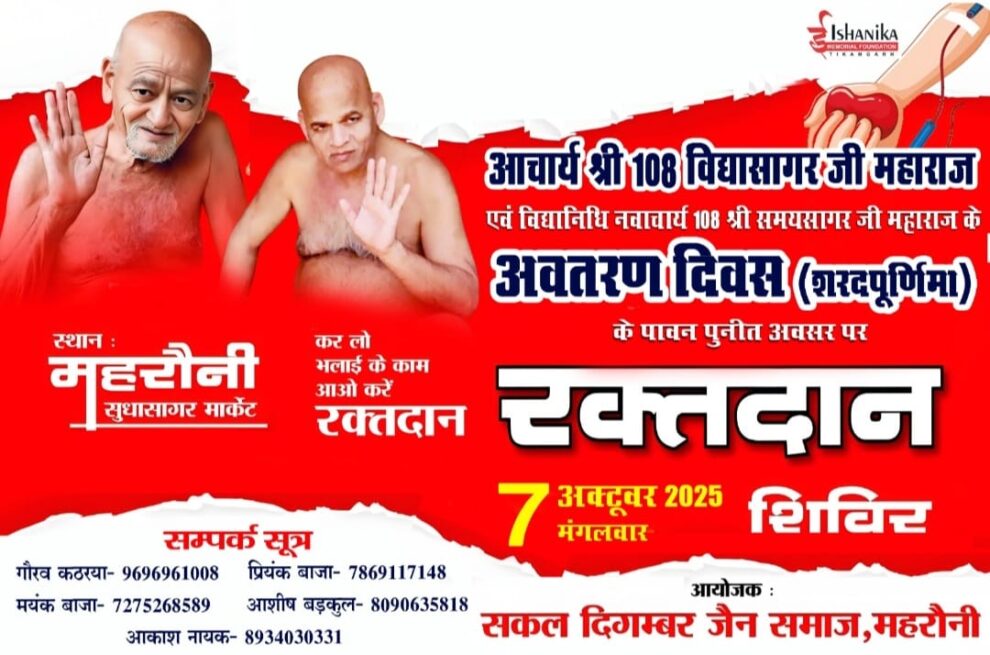 शरद पूर्णिमा पर आचार्य विद्यासागर जी एवं समयसागर जी महाराज के अवतरण दिवस के पावन अवसर पर महरौनी में सकल दिगम्बर जैन समाज द्वारा भव्य रक्तदान शिविर का आयोजन किया जा रहा है। पढ़िए पूरी रिपोर्ट…