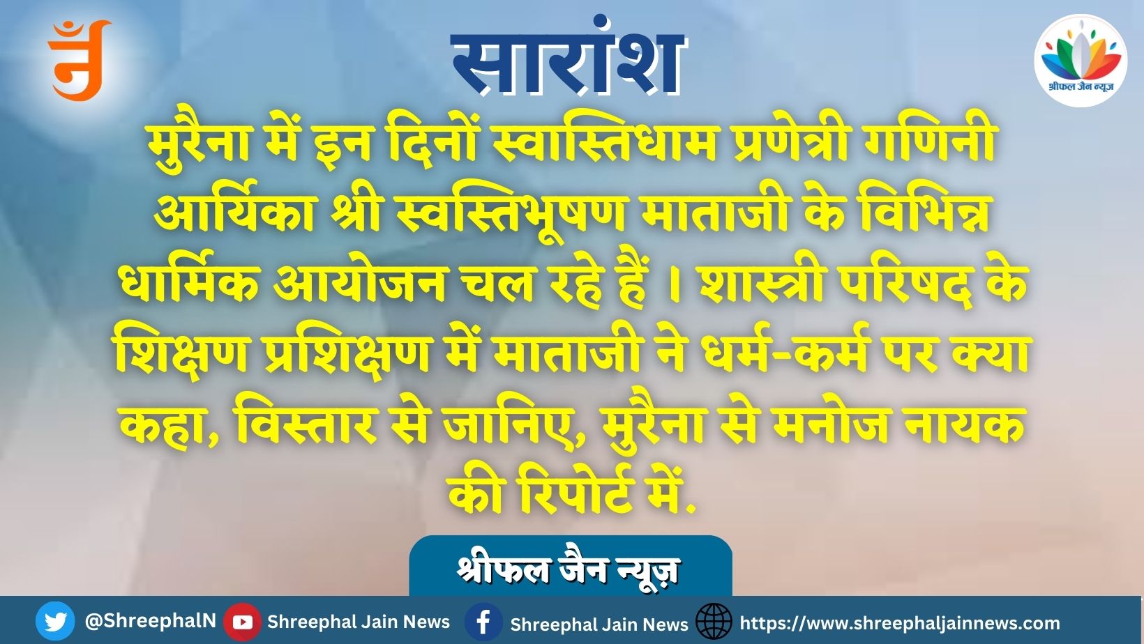 मनोज नायक- स्वस्तिधाम प्रणेत्री गणिनी आर्यिका श्री स्वस्तिभूषण माताजी का ज्ञानतीर्थ मुरेना में चल रहे शास्त्री परिषद के शिक्षण प्रशिक्षण शिविर में उद्बोधन हुआ । पूज्य गणिनी आर्यिका माताजी ने ज्योतिष शास्त्र के अनुसार नवग्रहों की व्याख्या करते हुए कहा कि यदि सांसारिक प्राणी सदाचरण के साथ जीवन यापन करता है तो बुरे ग्रहों का प्रभाव स्वमेव कम हो जाता है ।