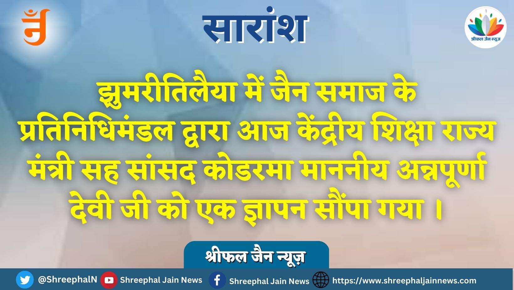 केंद्रीय शिक्षा राज्य मंत्री माननीय अन्नपूर्णा देवी जी ने समाज के लोगों को आश्वस्त करते हुए कहा कि सम्मेद शिखर पर्वत पर्यटन क्षेत्र नहीं पवित्र अहिंसक जैन तीर्थ क्षेत्र बने इस मुद्दे पर मैं सरकार और वन एवं पर्यावरण मंत्रालय से बात करूंगी और समस्या के समाधान के लिए काम करूंगी यह सभी जानकारी जैन समाज के मीडिया प्रभारी नवीन जैन राजकुमार अजमेरा ने दी ।