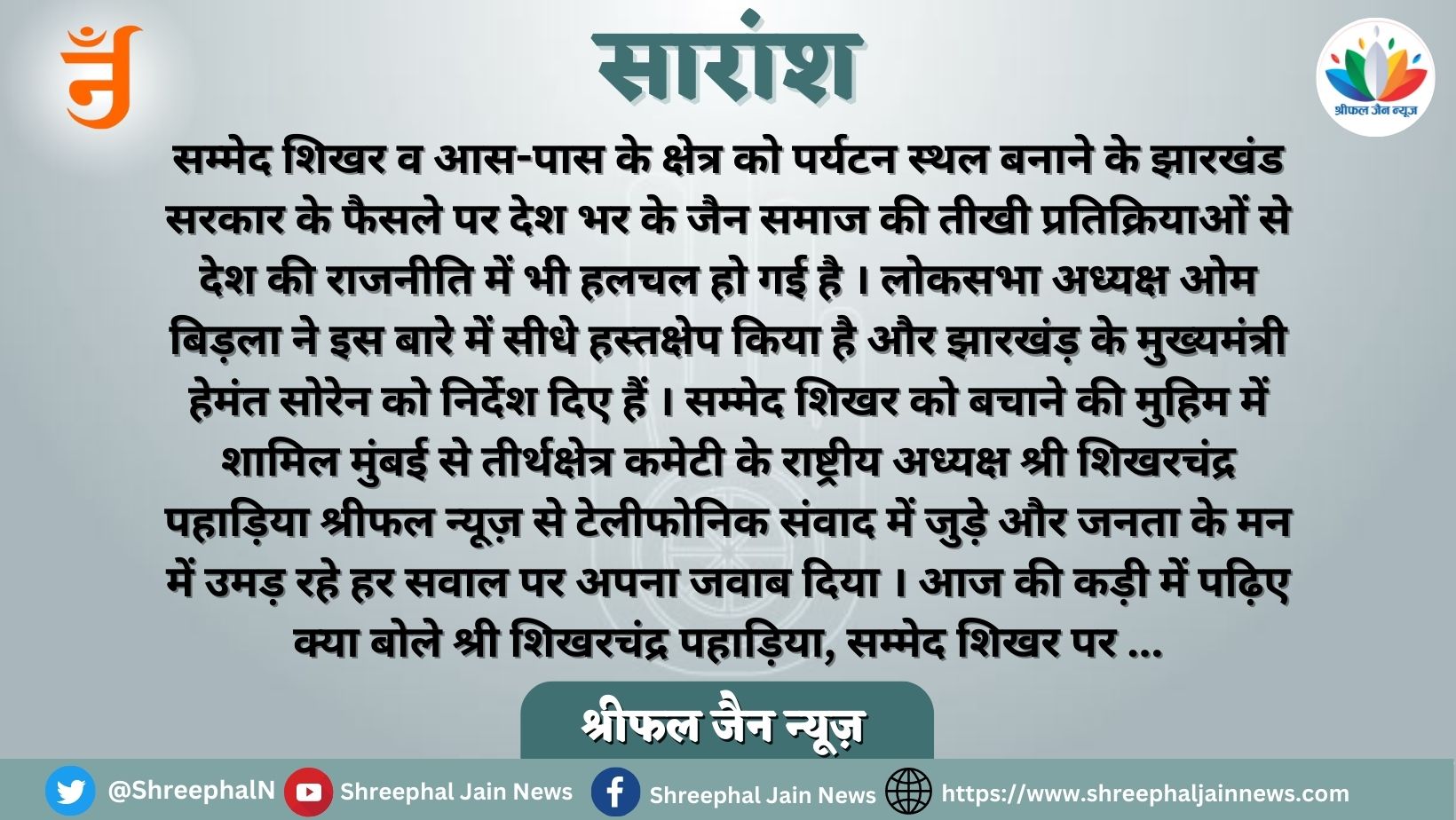 श्रीफल जैन न्यूज़ की राष्ट्रव्यापी मुहिम: सम्मेद शिखर पर जैन समाज के शिखर पुरूषों से संवाद , सम्मेद शिखर हमारा ह्रदय, शरीर में खून है तब तक इसकी रक्षा करेंगे – शिखरचंद्र पहाड़िया