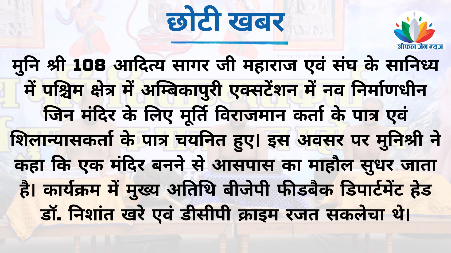 साथ ही जैन समाज के वरिष्ठ डॉ. जैनेन्द्र जैन हंसमुख गांधी, प्रदीप बड़जात्या, टी के वेद, विकास सोनल जैन, नकुल पाटौदी, पिंकी टोंग्या, रिषभ पाटनी, पंडित सतीश जैन एवं अन्य उपस्थित थे। अंत मे आभार समग्र जैन समाज अम्बिकापुरी परमहंस नगर न्यास समिति ने व्यक्त किया। यह जानकारी जैन समाज मीडिया प्रभारी राजेश जैन दद्दू ने दी।