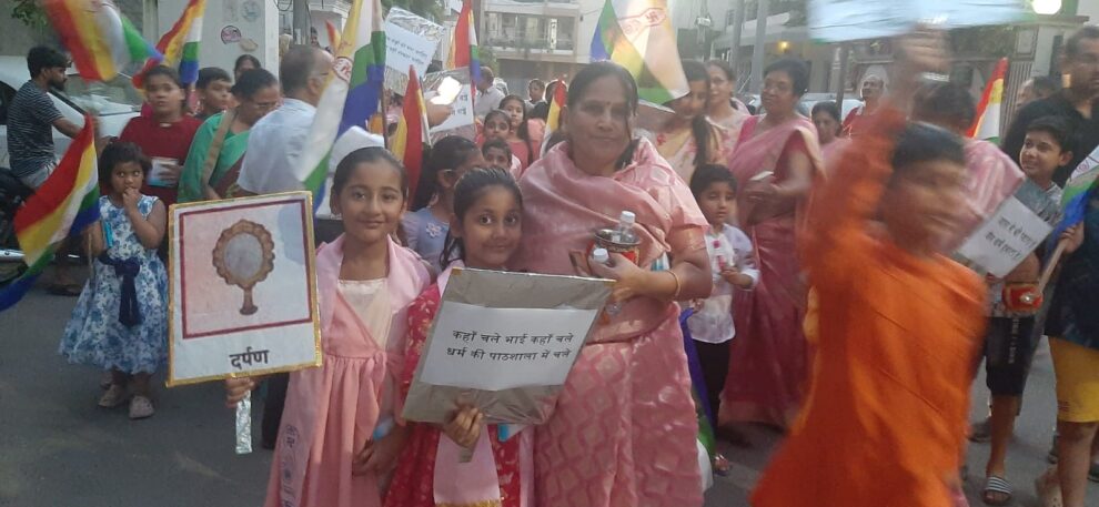 जयपुर। श्रमण संस्कृति संस्थान, सांगानेर के तत्वावधान में श्री दिगंबर जैन महिला महासमिति गायत्री नगर, महारानी फार्म के द्वारा श्रमण संस्कृति संस्कार शिविर का बालक- बालिकाओं की शोभा यात्रा के साथ 15 मई को शुभारम्भ किया गया। शिविर की मुख्य संयोजक मंजू सेवा वाली ने बताया कि शिविर 30 मई, 2024 तक चलेगा। यह शिविर श्री दिगम्बर जैन मंदिर गायत्री नगर, महारानी फार्म के परिसर में लगाया जा रहा है। शिविर के शुभारम्भ के अवसर पर एक जुलूस बैंड बाजे के साथ विभिन्न मार्गों से होता हुआ मन्दिर पहुंचा। जुलूस में बच्चे जैन ध्वज, स्लोगन की तख्तियां व जैन धर्म के नारे लगाते, उत्साह के साथ नाचते, झूमते चल रहे थे।