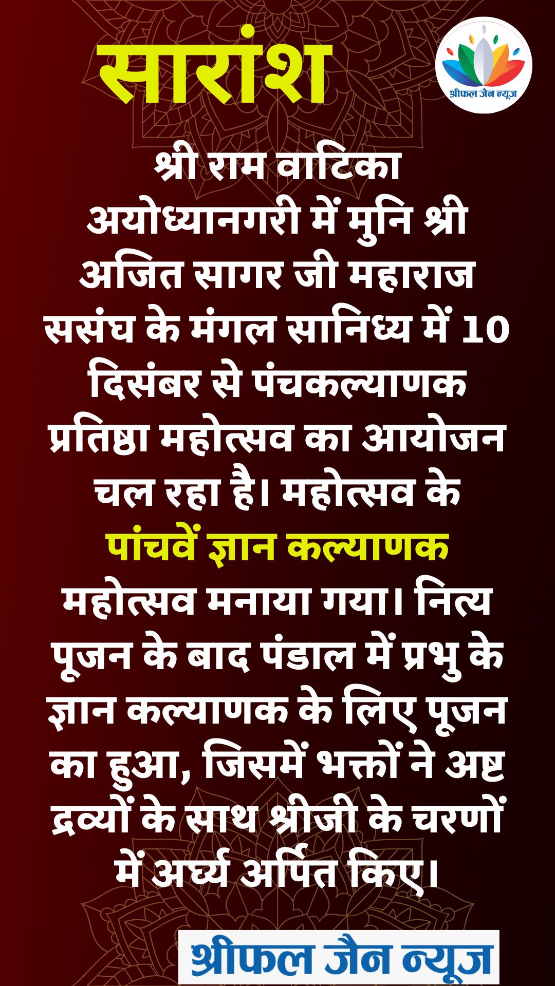 आगरा (शुभम जैन)। राहुल विहार स्थित चमरौली रोड के श्री राम वाटिका अयोध्यानगरी में मुनि श्री अजित सागर जी महाराज ससंघ के मंगल सानिध्य में 10 दिसंबर से पंचकल्याणक प्रतिष्ठा महोत्सव का आयोजन चल रहा है। महोत्सव के पांचवें ज्ञान कल्याणक महोत्सव मनाया गया। इस महोत्सव का शुभारंभ विधानाचार्य संजय भैया के निर्देशन में प्रभु के अभिषेक एवं शांतिधारा के साथ हुआ। भक्तों ने श्रद्धा पूर्वक प्रभु का नित्य पूजन संपन्न किया।