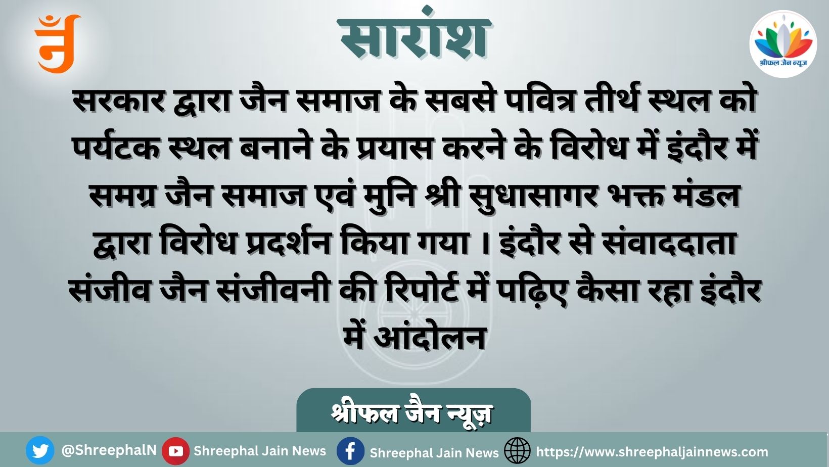 इंदौर. संजीव जैन ।  जहां तीर्थंकर व हजारों मुनिराज कठिन साधना करते हुए मोक्ष पधारे हैं । सम्मेद शिखर पर्वतराज हमारा पावन स्थल है । इसे पर्यटक स्थल किसी भी कीमत पर नहीं बनने देंगे । इन ऊर्जावान विचारों के साथ इंदौर में समग्र जैन समाज एवं मुनि श्री सुधासागर भक्त मंडल द्वारा विरोध प्रदर्शन किया गया ।