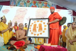 स्वामी जी ने रजत पुष्पों से मुनि श्री का पाद-पक्षालन किया और साथ ही पुष्प वर्षा की तथा आचार्य भद्रबाहु स्वामी के चरण-चिह्न भेंट किए। साथ ही श्रवणबेलगोला स्थित बाहुबली प्रतिमा का गंधोदक भी समर्पित किया।