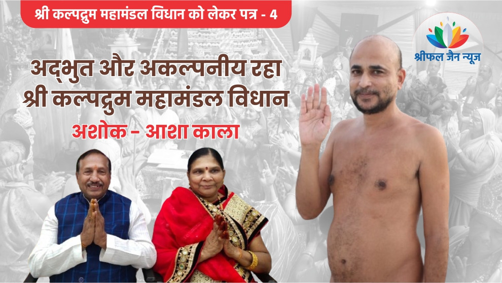 अंतर्मुखी मुनि पूज्य सागर महाराज एवं क्षुल्लक अनुश्रमण सागर महाराज के सानिध्य में श्री दिगम्बर जैन नव ग्रह ग्रेटर बाबा परिसर में 30 दिसंबर 2023 से 7 जनवरी तक श्री कल्पद्रुम महामंडल विधान का आयोजन किया गया। पत्रकारिता के क्षेत्र में उत्कृष्ट कार्य करने के लिए दिए जाने वाले प्रतिष्ठित श्रीफल पत्रकारिता पुरस्कार समारोह का आयोजन भी इसी कार्यक्रम में किया गया। आयोजन के बाद समाज के विभिन्न श्रेष्ठी जनों ने विधान की भव्यता को लेकर मुनि श्री को लिखा है। इसकी चौथी कड़ी में पढ़िए अशोक-आशा काला के विचार…