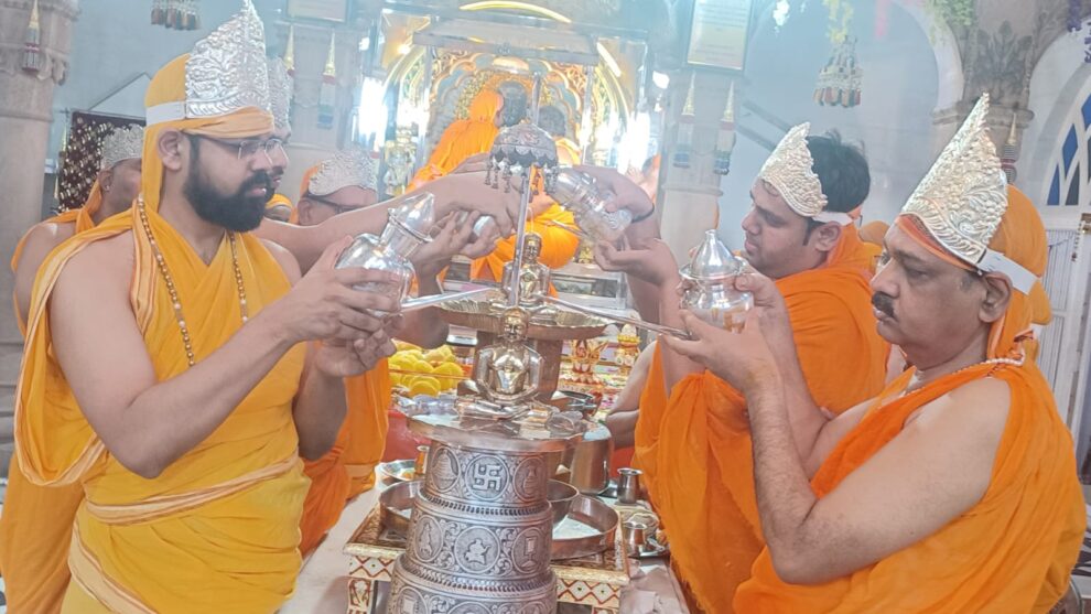 आगरा। समाधिस्थ आचार्यश्री ज्ञानसागर जी महाराज एवं आचार्यश्री सौरभसागर जी महाराज के मंगल आशीर्वाद से आगरा के गुदड़ी मंसूर खां स्थित सेठ श्री बिहारीलाल धर्मशाला के श्री शीतलनाथ दिगम्बर जैन मन्दिर में सोलह दिवसीय श्री शांतिनाथ महामण्डल विधान का आयोजन बड़े ही भक्तिभाव के साथ किया जा रहा है। जिसमें विधान के बारहवें दिन 17 जुलाई को भक्तों ने सर्वप्रथम स्वर्ण कलशों से प्रभु की वृहद शांतिधारा की। इस अवसर पर बाहर से पधारे भक्तों ने समाधिस्थ आचार्य श्री विद्यासागर जी महाराज एवं भगवान महावीर स्वामी के चित्र का अनावरण एवं दीप प्रज्ज्वलन किया।