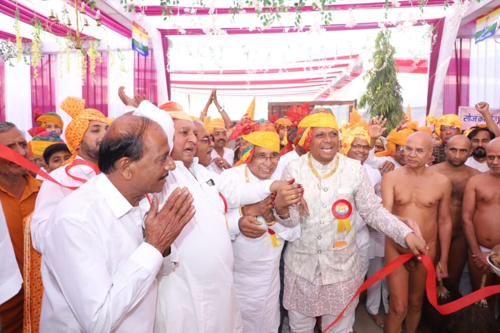 परतापुर। परम पूज्य मुनि श्री अजीत सागर निरागजी, ऐलक विवेक सागर जी महाराज के मंगल प्रवेश के समय घोड़ा, बग्घी, ऊंट, गाड़ी, बैंड-बाजों सहित नवयुग मंडल के युवा जैन धर्म ध्वजाएं साथ लिए चल रहे थे। विशाल घट यात्रा के साथ सिद्ध चक्र विधान का शुभारंभ गुरुवार को किया गया। आदिनाथ कॉलोनी में मंदिर जी में श्रीजी का अभिषेक, शांतिधारा के पश्चात् पंडाल शुद्धि हेतु 101 कलशों से जल भरकर विशाल शोभायात्रा के साथ मुनिश्री के संघ सहित सिद्ध चक्र विधान मंडल पंडाल पहुंचे। जहां पर मुनि श्री की अगवानी कर पाद प्रक्षालन पुष्पेंद्र जयंतीलाल, विरोधय ट्रस्ट कमेटी अध्यक्ष मोहनलाल जैन, मुकेश गांधी, रमलाल गांधी आदि द्वारा किया गया। जहां प्रतिष्ठा आचार्य सुयश प्रदीप भैया अशोक नगर मध्य प्रदेश, विधानाचार्य रमेश चंद्र गांधी, शैलेंद्र भैया, वीना दीदी के दिशा निर्देशन में सिद्ध चक्र महामंडल विधान का ध्वजा रोहण किया गया।