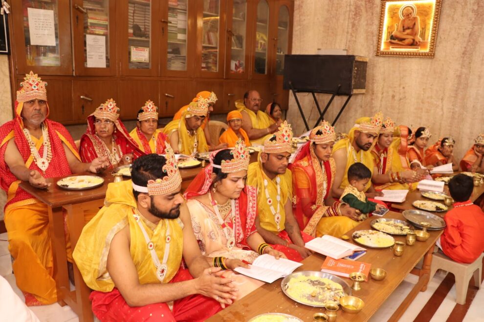 जबलपुर संस्कार धानी से आचार्य श्री विद्यासागरजी महाराज के शिष्य बाल ब्रह्मचारी प्रदीप शास्त्री ‘पीयूष’ के निर्देशन में कराया जा रहा है और सहयोगी पंडित महेश चंद्र शास्त्री और संगीतकार विमल जैन शास्त्री सागर द्वारा किया जा रहा है। मंगलवार को 1024 अर्घ्य सौधर्म इंद्र अशोक कुमार जैन-निर्मला जैन, महायज्ञ नायक- रामप्रकाश जैन-करिश्मा, धनपति कुबेर- सचिन जैन मेघा जैन, यज्ञनायक- अंकित जैन-माधवी जैन, श्रीपाल-मैनसुंदरी- विवेक जैन-रुचि जैन, ईशान इंद्र- प्रमोद जैन- मंजू जैन, महेन्द्र- गिरीश जैन-मालती जैन, सानत कुमार इंद्र- संजीव जैन-रेनू जैन, ब्रह्म इंद्र अरुण जैन-रचना जैन, ब्रह्मोत्तर इंद्र सतेंद्र जैन-मीना जैन, लान्तव इंद्र अतुल जैन-पिंकी जैन ने समर्पित किए। पूजन में सामूहिक रूप से सभी इंद्र-इंद्राणियो ने अर्घ्य चढ़ाने का सौभाग्य प्राप्त किया