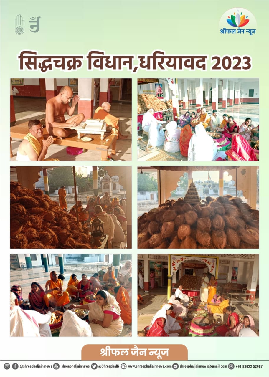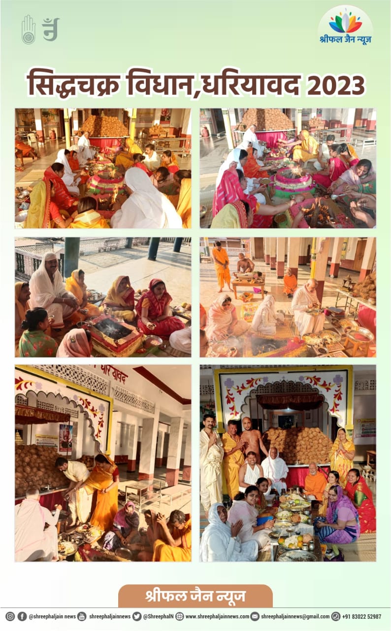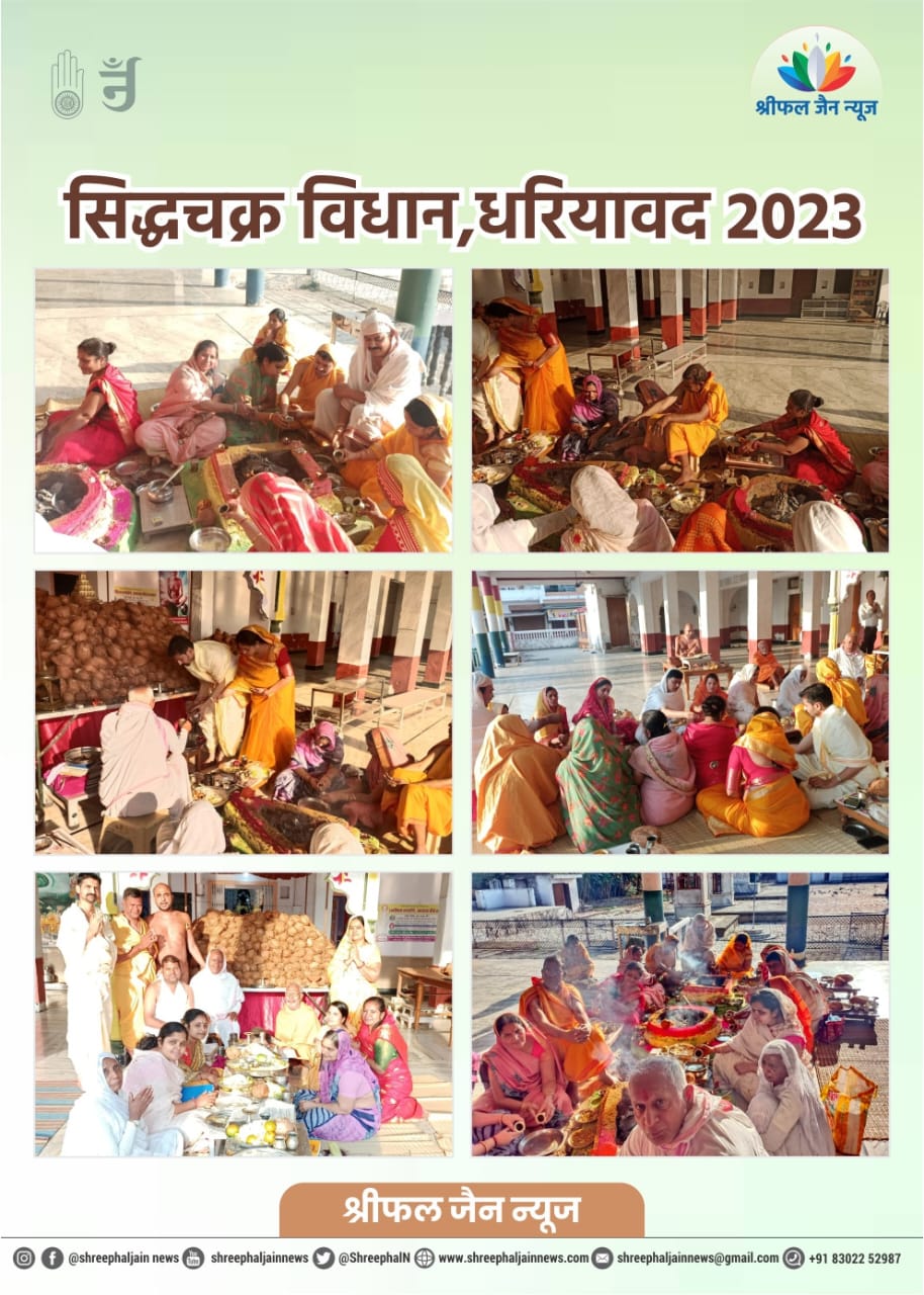 धरियावद। अंतर्मुखी मुनि पूज्य सागर महाराज और क्षुल्लक अनुश्रमण सागर महाराज के सानिध्य में श्री आदिनाथ दिगंबर जैन अतिशय क्षेत्र, नसियां में अष्टानिक पर्व के सिद्धचक्र विधान का आयोजन किया गया। विधान का प्रारंभ एक मार्च से हुआ था, जिसका समापन आठ मार्च को किया गया। इन आठ दिनों 2040 श्रीफल अर्घ्य भगवान को अर्पित किए गए।