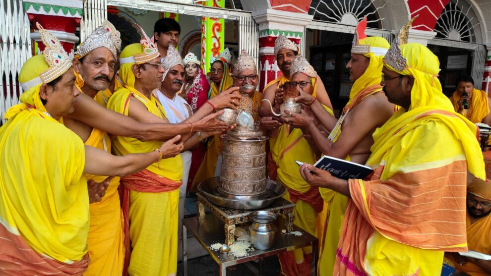 रायपुर। अष्टान्हिका महापर्व पर सिद्धचक्र विधान महामंडल के तहत 1008 आदिनाथ दिगंबर जैन बड़ा मंदिर मालवीय रोड में चल रहे 8 दिवसीय श्री सिद्ध चक्र महामंडल विधान के सातवें दिन विधान के मंडल पर कुल 1024 अर्घ्य चढ़ाए गए। ट्रस्ट कार्यकारिणी कमेटी के अध्यक्ष संजय जैन नायक एवं मीडिया प्रभारी प्रणीत जैन ने बताया कि आज पांडुक शीला में विराजमान भगवान का सर्वप्रथम स्वर्ण कलशों से अभिषेक किया गया।