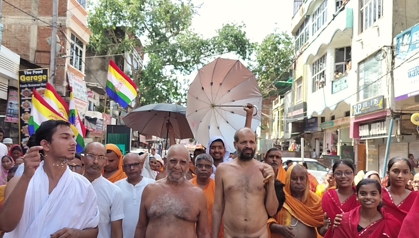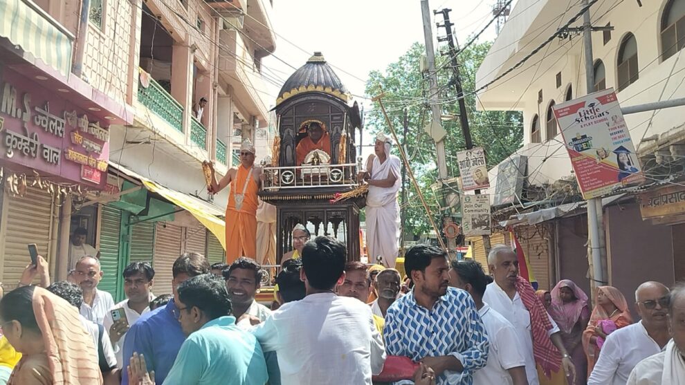 बैंडबाजों व घोड़ा बग्घी के साथ बड़े जैन मंदिर से रथ यात्रा प्रारंभ होकर नगर के प्रमुख मार्गों से भ्रमण करती हुई बड़े जैन मंदिर पहुंची। भव्य शोभा यात्रा में मुनिराज श्री जिनेंद्र प्रभु के रथ के आगे आगे चल रहे थे। तीन लोक के नाथ के रथ को युवा साथी अपने हाथों से खींच रहे थे। शोभायात्रा के दौरान विभिन्न स्थानों पर श्रीजी की आरती की गई एवं युगल मुनिराजों का पाद प्रक्षालन कर भव्य अगवानी की गई। घोड़ा बग्गियों में सिद्धचक्र विधान के विशेष इंद्र इंद्राणी विराजमान थे।