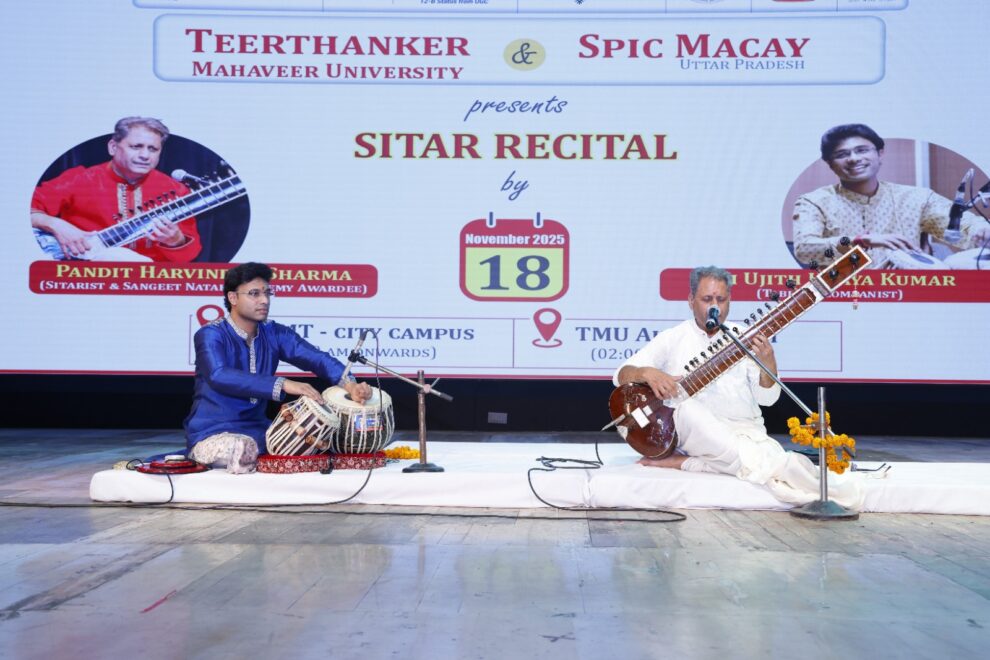 तीर्थंकर महावीर यूनिवर्सिटी, मुरादाबाद के ऑडिटोरियम में आयोजित सितार और तबला जुगलबंदी ने विद्यार्थियों का मन मोह लिया। पंडित (डॉ.) हरविंदर शर्मा और युवा तबला कलाकार उजिथ उदय कुमार की बेहतरीन प्रस्तुति ने श्रोताओं में भारतीय शास्त्रीय संगीत के प्रति अद्भुत आकर्षण जगाया। कार्यक्रम में 700 से अधिक विद्यार्थी शामिल हुए। पढ़िए प्रो. श्याम सुंदर भाटिया की रिपोर्ट…