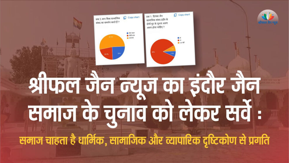 श्रीफल जैन न्यूज की ओर से इंदौर जैन समाज के चुनाव को लेकर कराए सर्वे में 286 लोगों ने भाग लिया। इस सर्वे में धार्मिक नेता नहीं, बल्कि आम श्रावक शामिल थे। सर्वे में 85 प्रतिशत लोगों ने एक चुनाव के पक्ष में अपनी राय दी। 7.5 प्रतिशत लोग चाहते हैं कि चुनाव अलग-अलग हों। 52.5 प्रतिशत लोग दोनों संसदों का समर्थन करते हैं, जबकि 22.5 प्रतिशत लोग कीर्ति स्तंभ और 25 प्रतिशत लोग शीश महल को समर्थन देते हैं। पढ़िए यह विशेष रिपोर्ट…