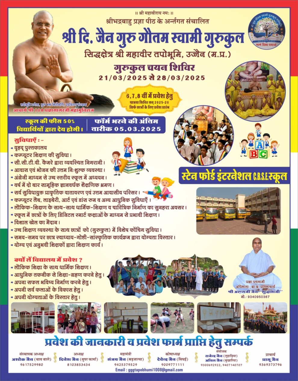 उज्जैन। आचार्य भद्रबाहु प्रज्ञा पीठ एवं तपोभूमि प्रेरणा आचार्य प्रज्ञासागर जी के आशीर्वाद से संचालित गुरु गौतम स्वामी गुरुकुल तपोभूमि एवं स्टेन फोर्ट इंटरनेशनल सीबीएसई स्कूल में प्रवेश के लिए चयन प्रवेश शिविर का भव्य आयोजन होगा। 21 से 28 मार्च तक इसमें भाग ले सकेंगे। इसके लिए फॉर्म भरने की अंतिम तिथि 5 मार्च रखी गई है। सभी इच्छुक अभ्यर्थी अपना प्रवेश फॉर्म 5 मार्च तक वॉट्सएप और ईमेल के माध्यम से भेज सकते हैं। केवल कक्षा 6, 7 और 8 (इंग्लिश मीडियम, सीबीएसई बोर्ड) के छात्र ही आवेदन कर सकते हैं। प्रवेश शुल्क स्कूल की कुल फीस का केवल 50 प्रतिशत शुल्क अभिभावकों को देना होगा। शिविर के लिए छात्रों को अपने सभी प्रमाण पत्र (जन्म प्रमाण पत्र, आधार कार्ड, पिछले वर्ष की मार्कशीट, मेडिकल सर्टिफिकेट एक माह से अधिक पुराना न हो आदि) के साथ आना अनिवार्य है। विशेष सुविधाएं भी हैं। निःशुल्क शिक्षा भी दी जाती है। गुरुकुल में छात्रों के निवास, भोजन, विद्यालय आने-जाने की सुविधा, कोचिंग, धार्मिक शिक्षण एवं अन्य आवश्यक व्यवस्थाएं पूरी तरह निःशुल्क होंगी। छात्रों को उत्कृष्ट शैक्षणिक एवं आध्यात्मिक वातावरण प्रदान किया जाएगा। जिससे उनका सर्वांगीण विकास हो सके।