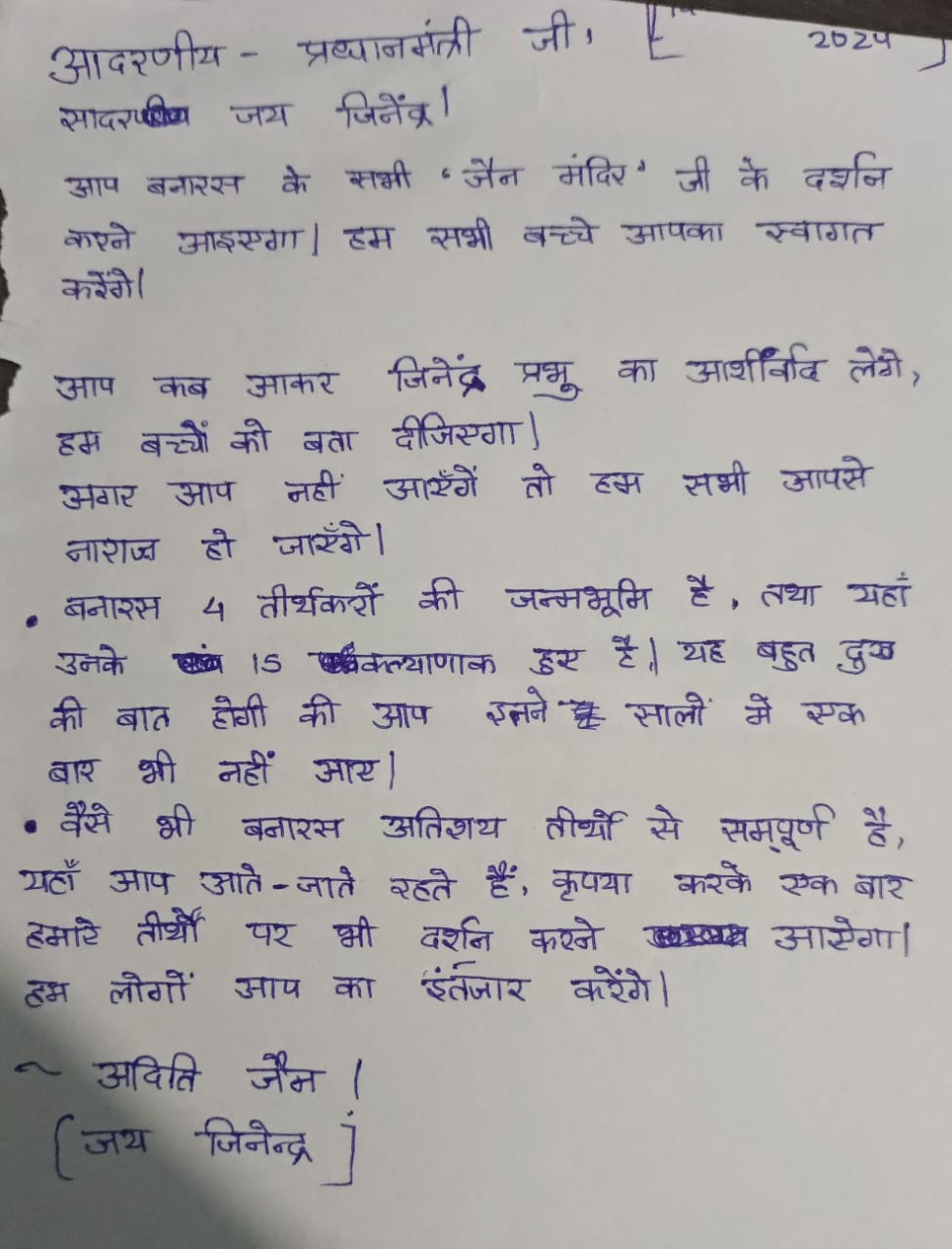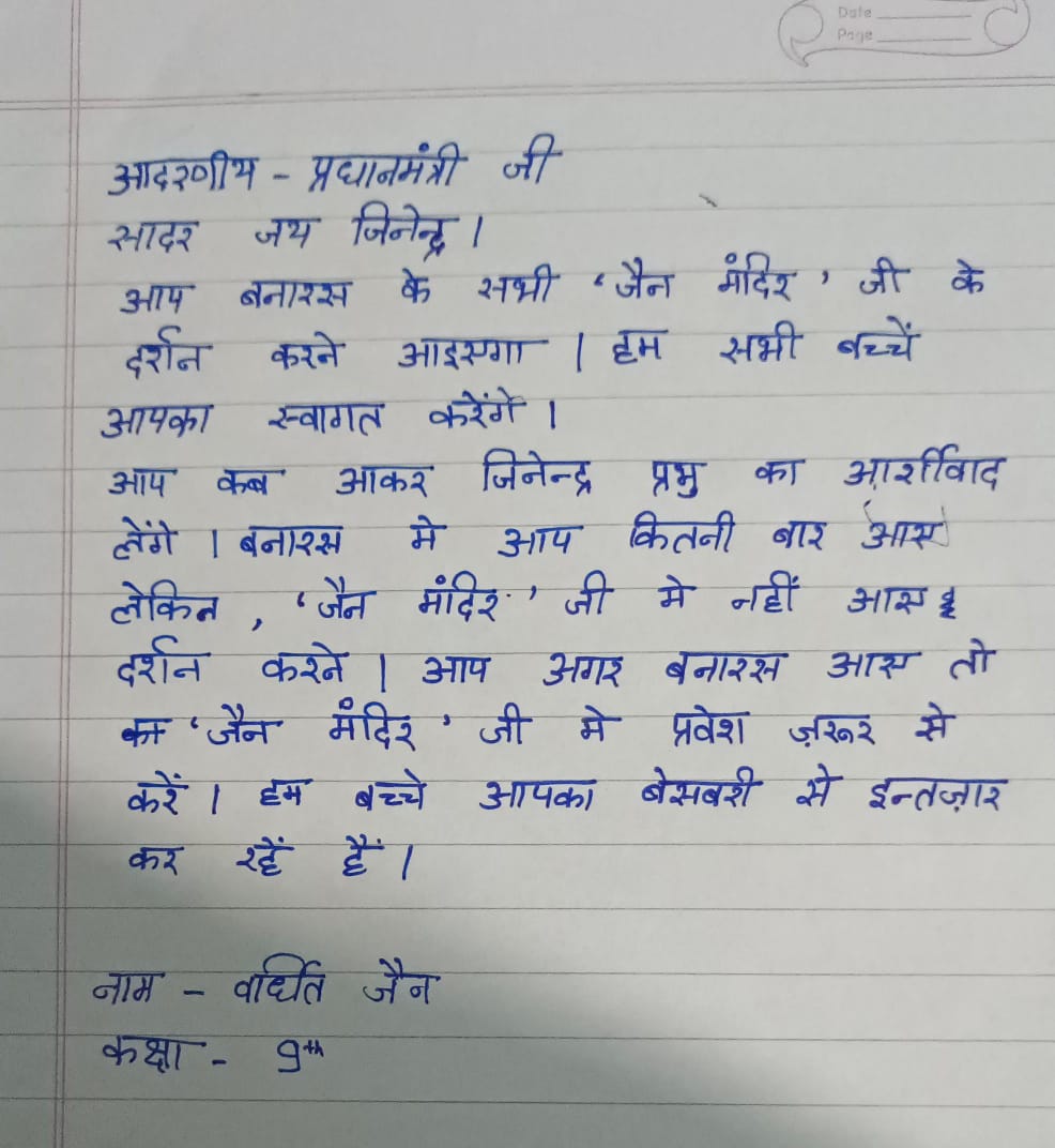 बच्चों को विश्वास है कि ये पत्र माननीय प्रधानमंत्री जी तक अवश्य पहुंचेंगे एवं वे बच्चों की भावनाओं को पूरा करने के उद्देश्य से बनारस के जैन मंदिरों के दर्शन कर जिनेन्द्र प्रभु का आशीर्वाद लेंगे एवं बच्चों से मिलकर ,उनकी यह भावना अवश्य पूरी करेंगे ।