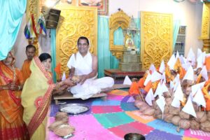 भिलूड़ा। अंतर्मुखी मुनि श्री पूज्य सागर जी महाराज के आशीर्वाद व निर्देशन में श्रीफल परिवार, भीलूड़ा के तत्ववाधान में भावेश/चांदमल जी भरड़ा के निवास पर भक्तामर...