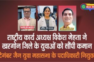 भारतवर्ष दिगंबर जैन युवा महासभा के राष्ट्रीय कार्य अध्यक्ष विकेश मेहता ने खरगोन जिले में जिला अध्यक्ष पद पर पारस जैन कासलीवाल, महिला शाखा अध्यक्ष उर्मिला जैन...