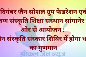 दिगंबर जैन सोशल ग्रुप फेडरेशन ने श्रमण संस्कृति संस्थान सांगानेर के संयुक्त तत्वाधान में इंदौर शहर के प्रमुख 18 मंदिरों में श्रवण संस्कृति संस्कार शिविर का...