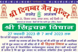 सारांश उत्तम नगर स्थित श्री दिगम्बर जैन मंदिर में दिनांक 27 फरवरी 2023 से 07 मार्च 2023 तक श्री सिद्धचक्र विधान का आयोजन होगा। इस अवसर पर कई मांगलिक...