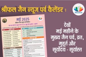 मई महीने के मुख्य जैन पर्व, व्रत, मुहूर्त और सूर्योदय – सूर्यास्त आप हमारे श्रीफल जैन पर्व कैलेंडर में देख सकते हैं। प्रस्तुति संपादक रेखा संजय...