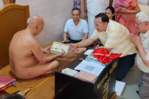 मुनि श्री पूज्य सागर जी के प्रथम शिक्षा गुरु और व्रत प्रदाता आचार्य श्री वर्धमान सागर जी को जिनवाणी माता श्री नमीष जैन, अध्यक्ष पोरवाड़ समाज, इंदौर ने आचार्य...