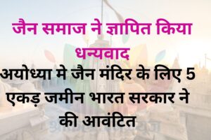 अयोध्या में केवडिया कॉलोनी में भारत सरकार ने जैन मंदिर, म्यूजियम और भोजनालय बनाने के लिए 5 एकड़ जमीन एवं बांधकाम की ग्रांट मंजूर की है। ये काम सीधे प्रधानमंत्री...
