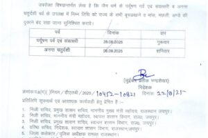 जयपुर में पर्यूषण पर्व एवं संवत्सरी (28 अगस्त) और अनंत चतुर्दशी (6 सितम्बर) के अवसर पर राजस्थान के सभी बूचड़खाने, मांस-मछली व अण्डे की दुकानों को बंद रखने का...