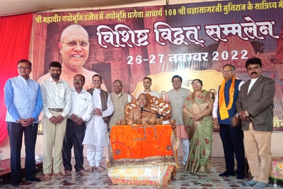 उज्जैन (डॉ. नीलम जैन)। महावीर तपोभूमि उज्जैन में ‘उज्जैन का जैन इतिहास’ विषय पर आचार्यश्री पुष्पदंत सागर जी के प्रखर शिष्य आचार्यश्री प्रज्ञासागर जी मुनिराज ससंघ के पावन सान्निध्य में द्वि-दिवसीय ‘विशिष्ट विद्वत् सम्मेलन’ संपन्न हुआ। संगोष्ठी का उद्घाटन सत्र 26 नवंबर 2022 को प्रातः 8 बजे अनुराग जैन के मंगलाचरण के साथ प्रारंभ हुआ।